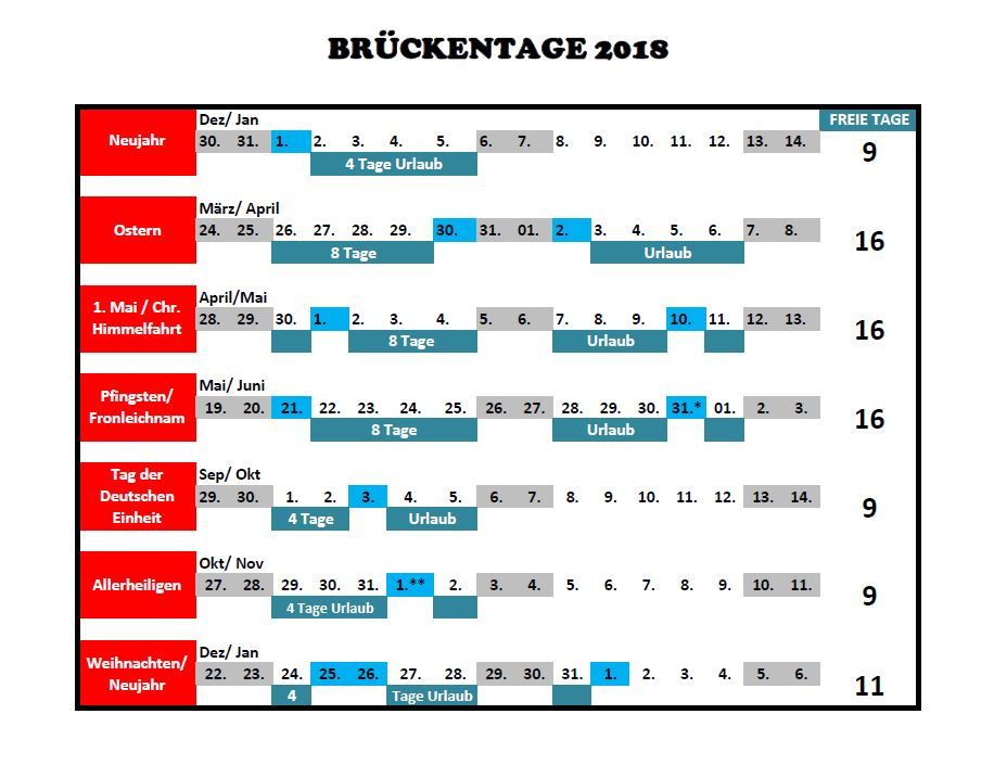 Als Arbeitnehmer darfst du dich auch in diesem Jahr wieder über ganz viel Freizeit freuen. Wenn du clever planst, kannst du deinen Urlaub locker verdoppeln. Dank der wunderbar gelegenen Feier-und Brückentage in 2018 ist ein minimaler Einsatz an Urlaubstagen nötig, um ganz viele Ferien zu bekommen. In unserer Übersicht erfährst du ganz leicht, wie du wann Urlaub einreichen musst. Nur allzu lange Warten würden wir nicht damit…. Ein Geheimnis sind die Brückentage in 2018 sicher nicht.