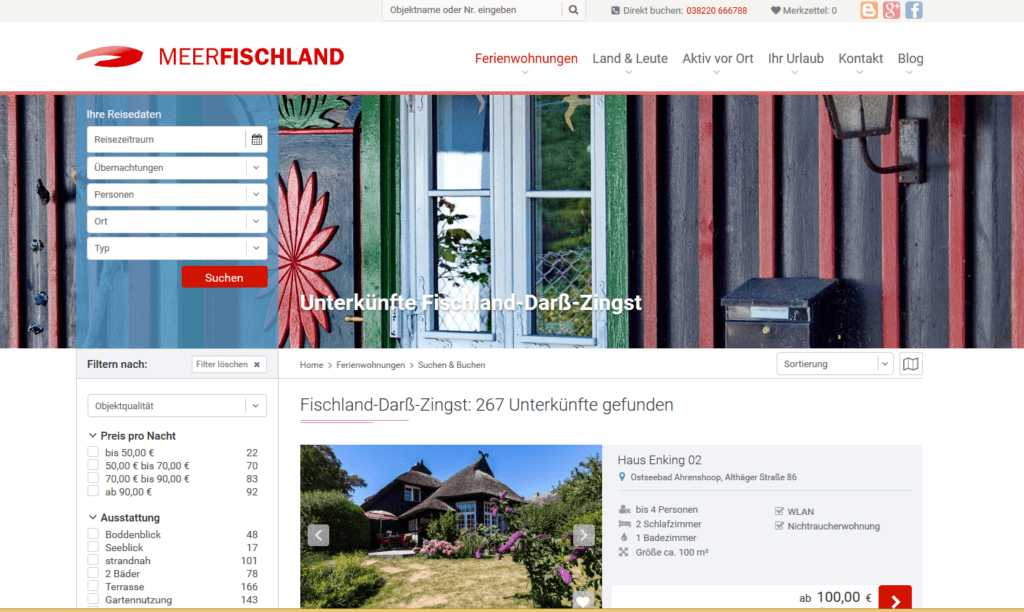 Wenn du schon alle Urlaubsdaten parat hast, findest du unter dem Reiter „Ferienwohnungen“ eine Box mit Auswahlkriterien. Beispielsweise, ob sie strandnah sein soll oder du deinen geliebten Vierbeiner mitnehmen darfst. Einfach anklicken was dir wichtig ist und aus einem bunten Strauß an traumhaften Ferienhäusern – und Wohnungen auswählen. Einfacher geht’s nicht.